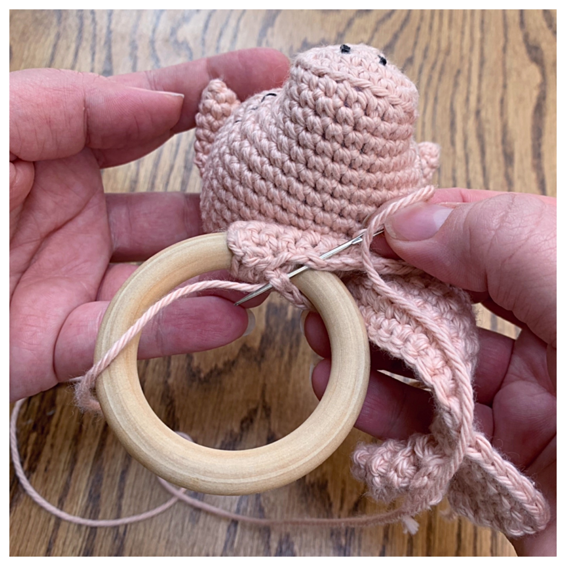Yarn I am using for this example is I love this Cotton in the color Warm Blush. You will need to add your rattle insert into the center of the piggy head before closing.