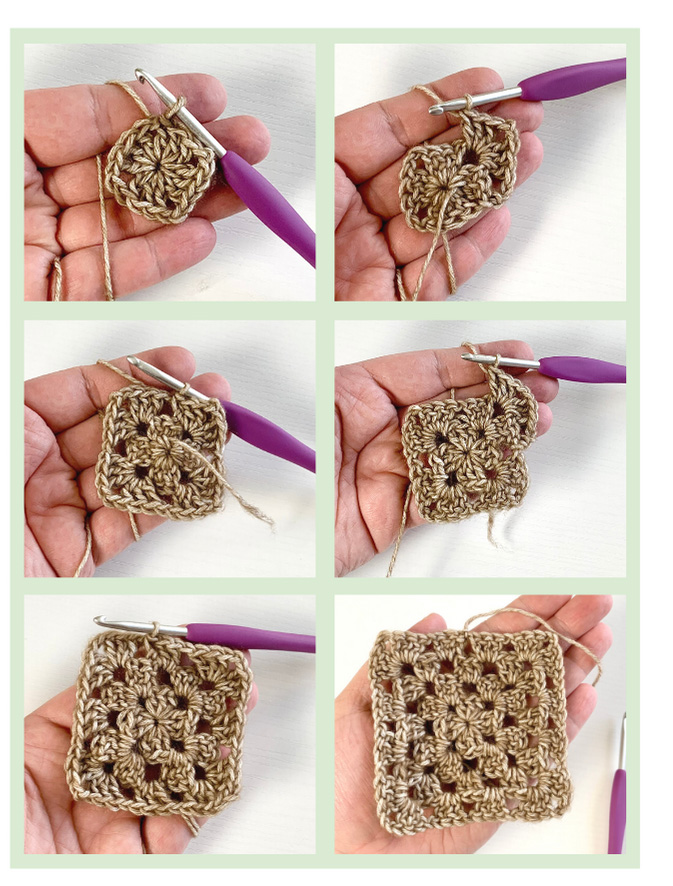 Some granny squares are made with one right side and one wrong side. This means the square is not turned after every round. Other squares are made with turning after every round so there is no right side. The benefit to turning is the square will even itself out and not end up slanted to one side when finished. This leaves a cleaner-looking square. In these squares, you will not be working into the stitches of the previous round, you will be working into the ch1 or ch2 sp(corner) of the previous round. Take care to sew in your ends as you make your squares, to save yourself time when finished.