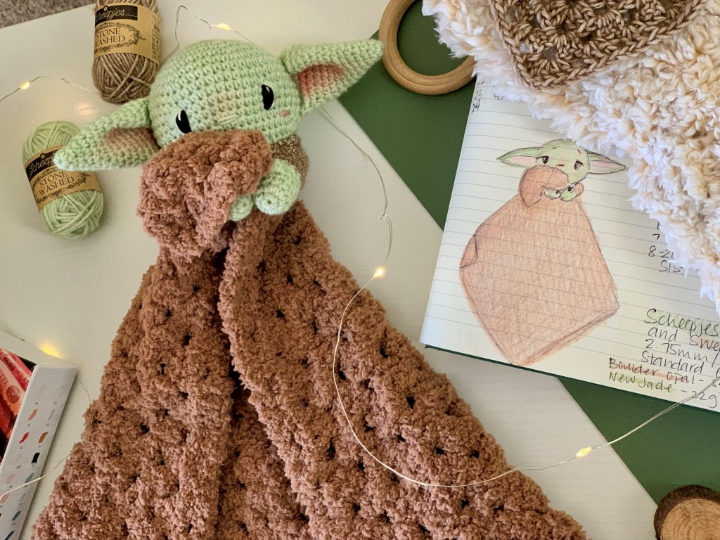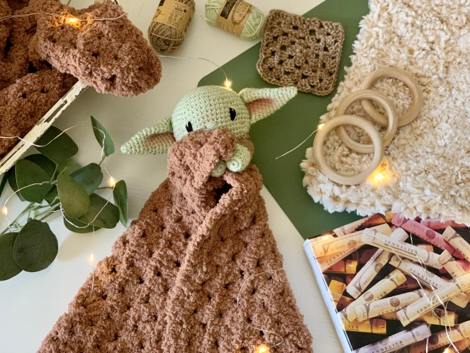 Baby aliens have always been a part of pop culture. From small children to grown adults, there is a soft spot for this baby alien, in particular. “Yoyo” is a sweet snuggly amigurumi alien, attached to a standard granny square blanket. Perfect for teaching new babies to cuddle, bringing comfort and sweet dreams. A perfect gift for a mom-to-be, or a family with a new baby!