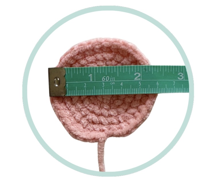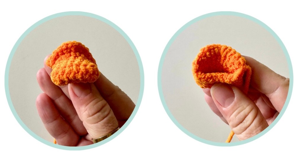 Rnd 2: Work in the next available st, on the opposite side of the piece, inc, 5sc, continue working around, inc, 5sc (14)