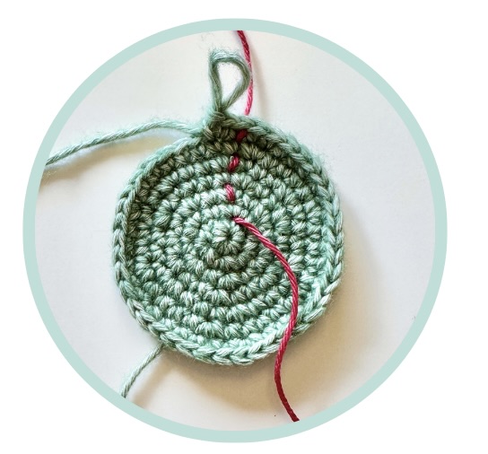 I prefer to use a scrap piece of cotton yarn, in a contrasting color, for my running stitch marker so there are no fiber transfers. (Using a fuzzy yarn can leave behind an unwanted trail.) Simply use your crochet hook to weave the piece of cotton in and out of the last st of the round, creating a woven st marker that can be easily removed when we are finished with our project. Just pull on one end and it will come right out!