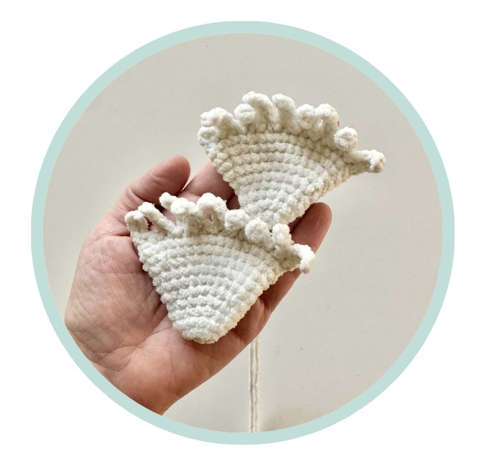 Rnd 12: Fold the wing in half and work through both sides for Rnd 12. Do not stuff the wings. [sc, ch5, starting in the 2nd ch from hook, sc in each ch, sl st into the next st] x 8. You should have one st left to work, ch5, starting in the 2nd ch from hook, sc in each ch, sl st into the last st.