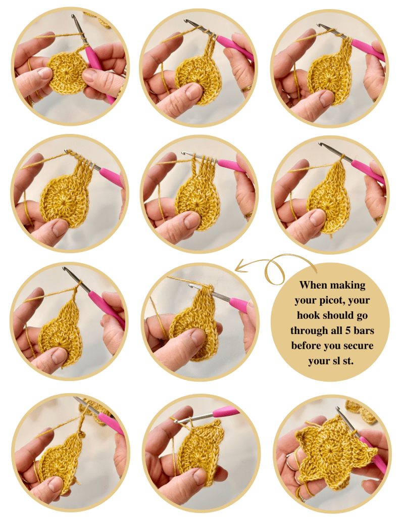 picot – ch3, sl st into the front bars of the previous st. Reference photos below..
