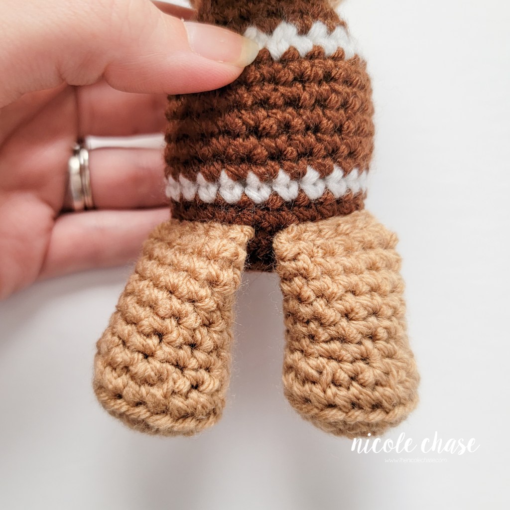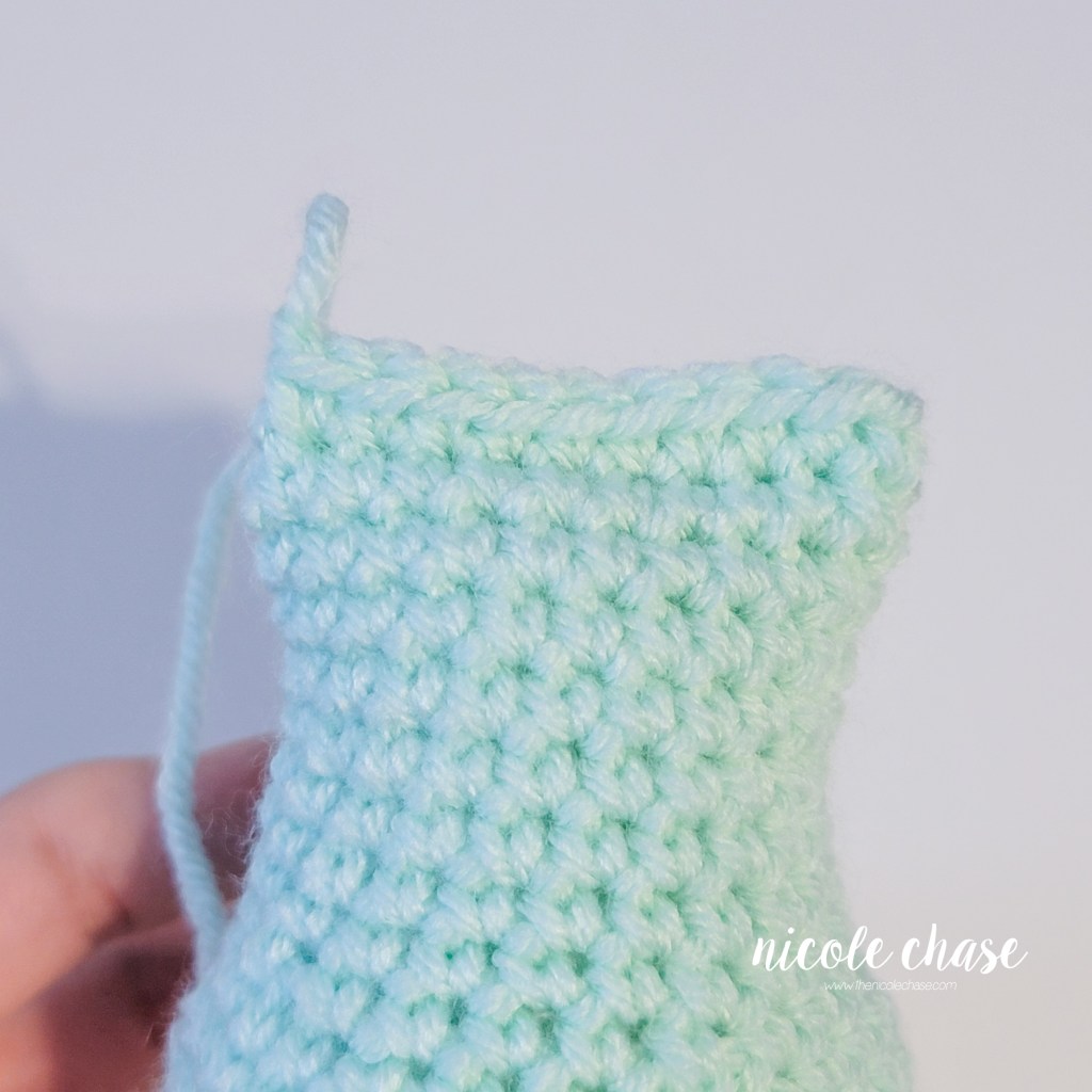 R11: Fold the leg closed. Working through both sides to close, 1 SC in each st across, leaving 1 unworked st on each side. (5 sts)