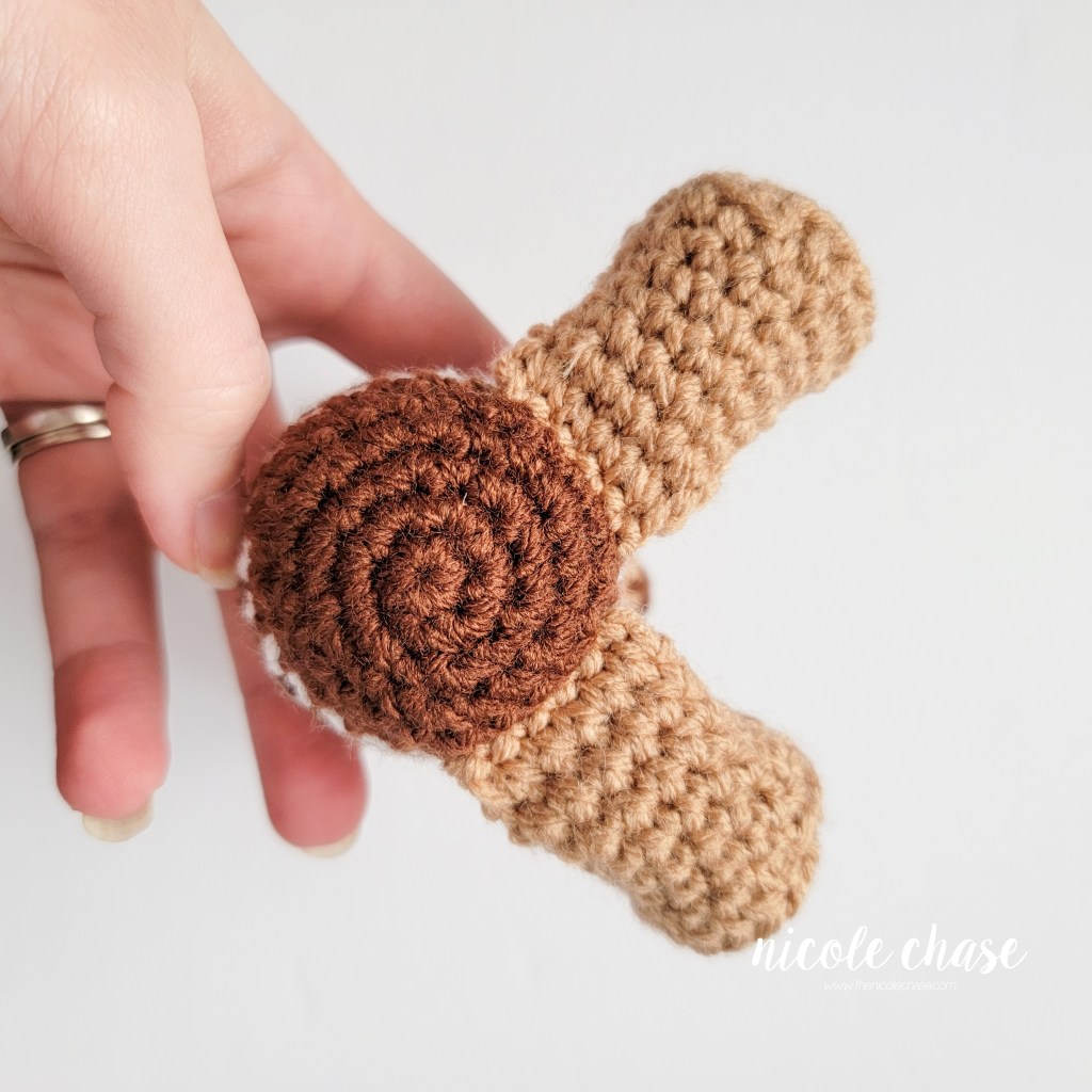 R10: Fold the arm closed. Working through both sides to close, 1 SC in each st across, leaving 1 unworked st at the beginning of the fold. (4 sts)