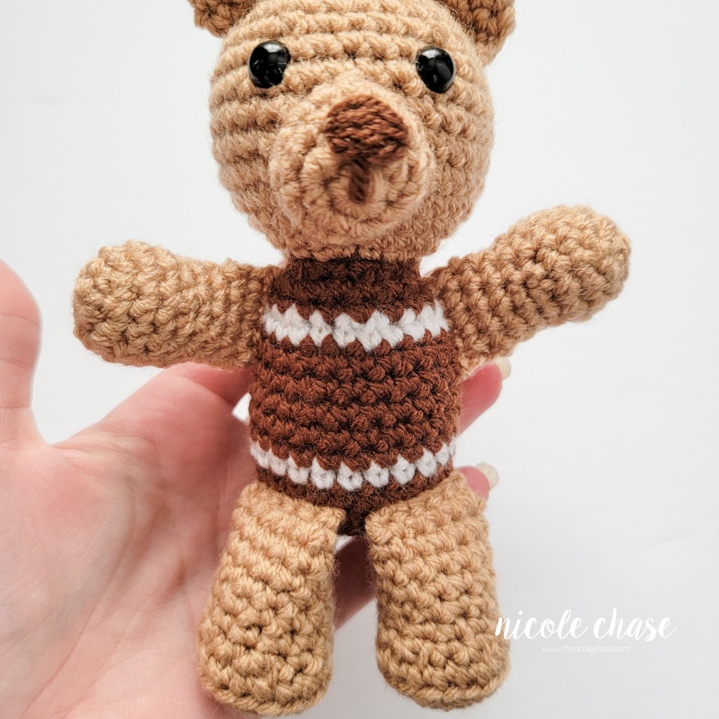 Safety eyes and noses pose a choking risk for babies; therefore, if making this toy for a baby, I recommend using yarn, felt, or embroidered details.