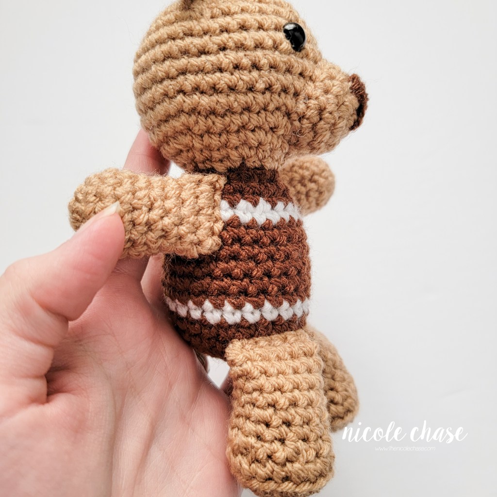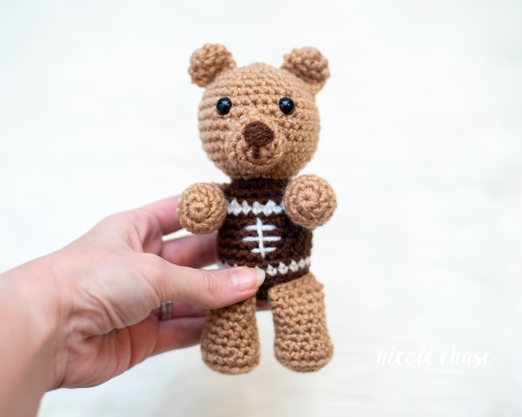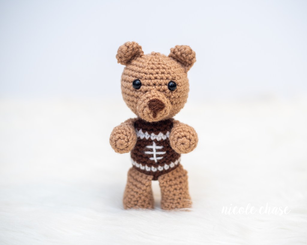 Using white yarn, embroider a horizontal line on R9, 10, and 11, over approximately 3-4 stitches, and one vertical line down the middle, over approximately 4 rows, to resemble a football.