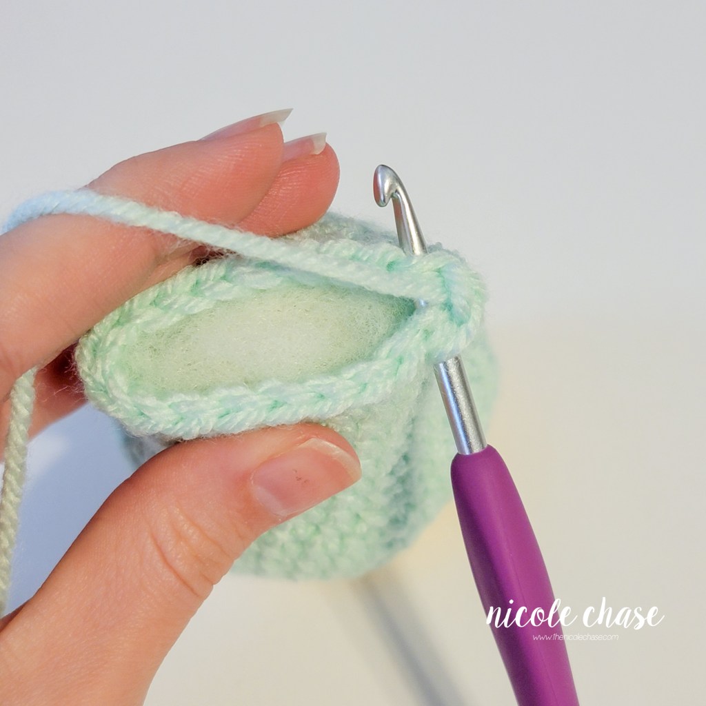 R30: *SC2tog, 1 SC in next st. Repeat from * around. (12 sts)