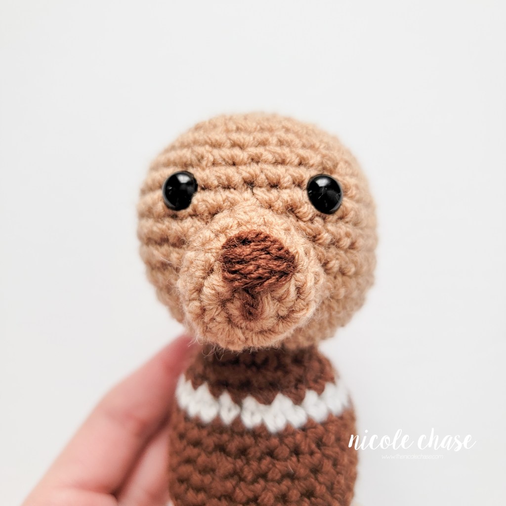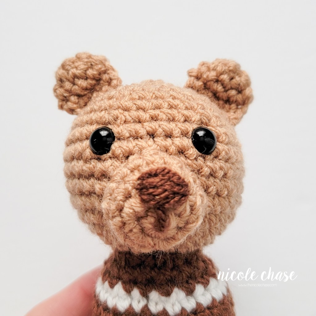 Using dark brown yarn, embroider nose on the snout at R2-3, with a line downwards to the middle of the magic ring.