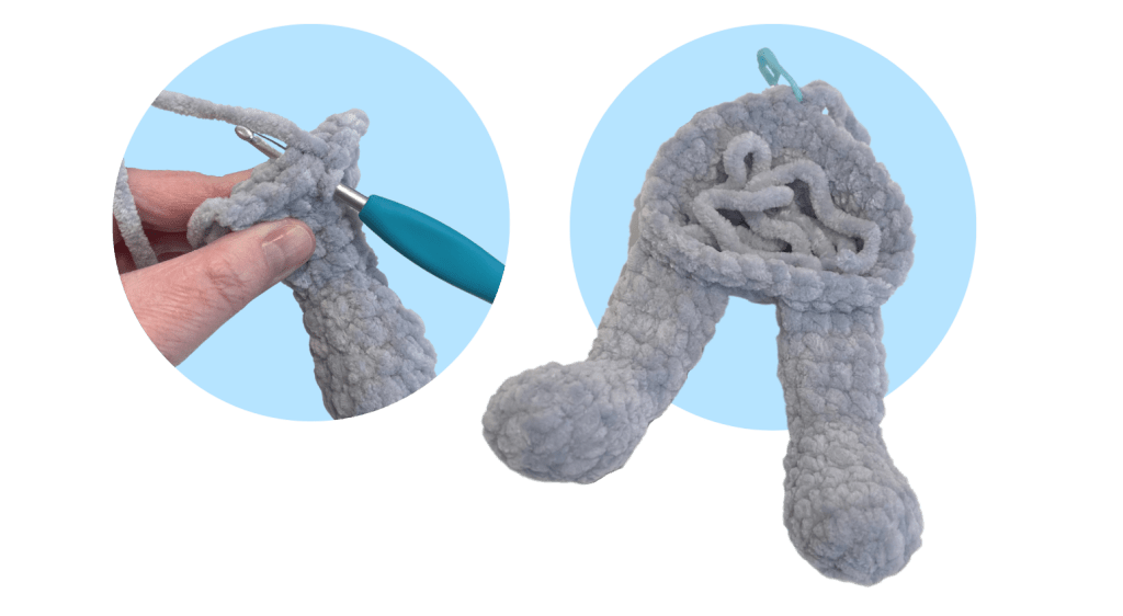 Tip: the sl sts in rounds 7 & 8 of the Feet/Legs count as sts. Do not work them too tightly or it may be difficult to work into them in following rounds.