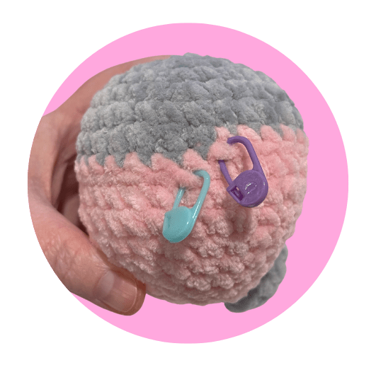 Turn Body upside down and attach yarn with a sl st to last front loop left open in round 9 of the Body. (Blue marker in photo below.)