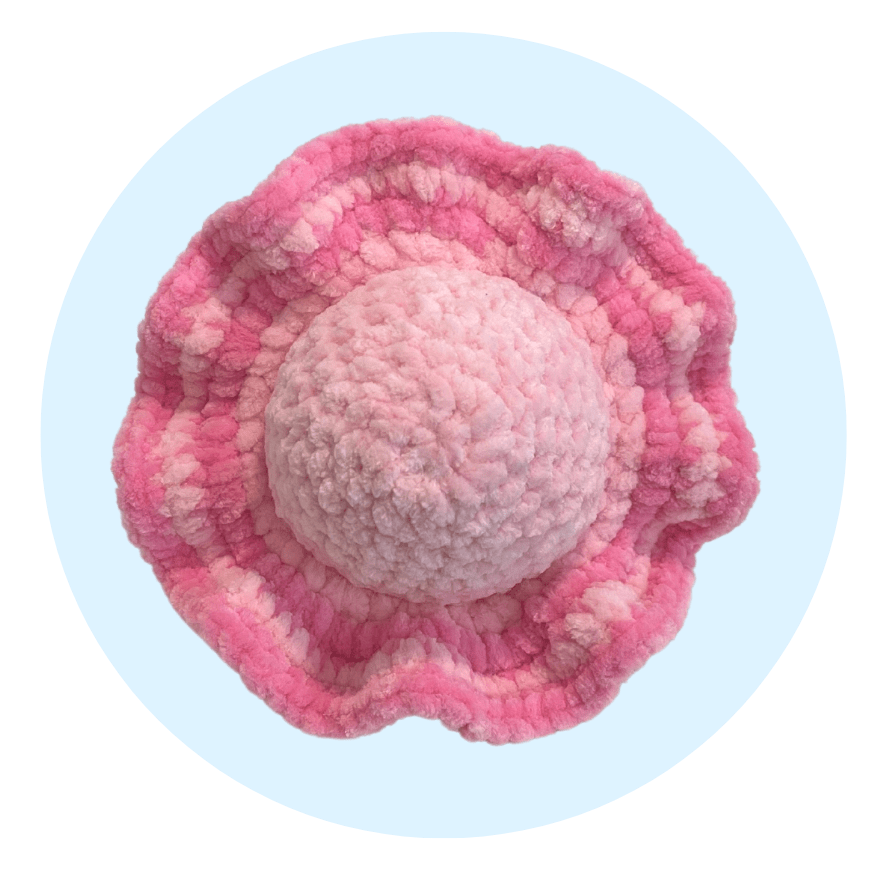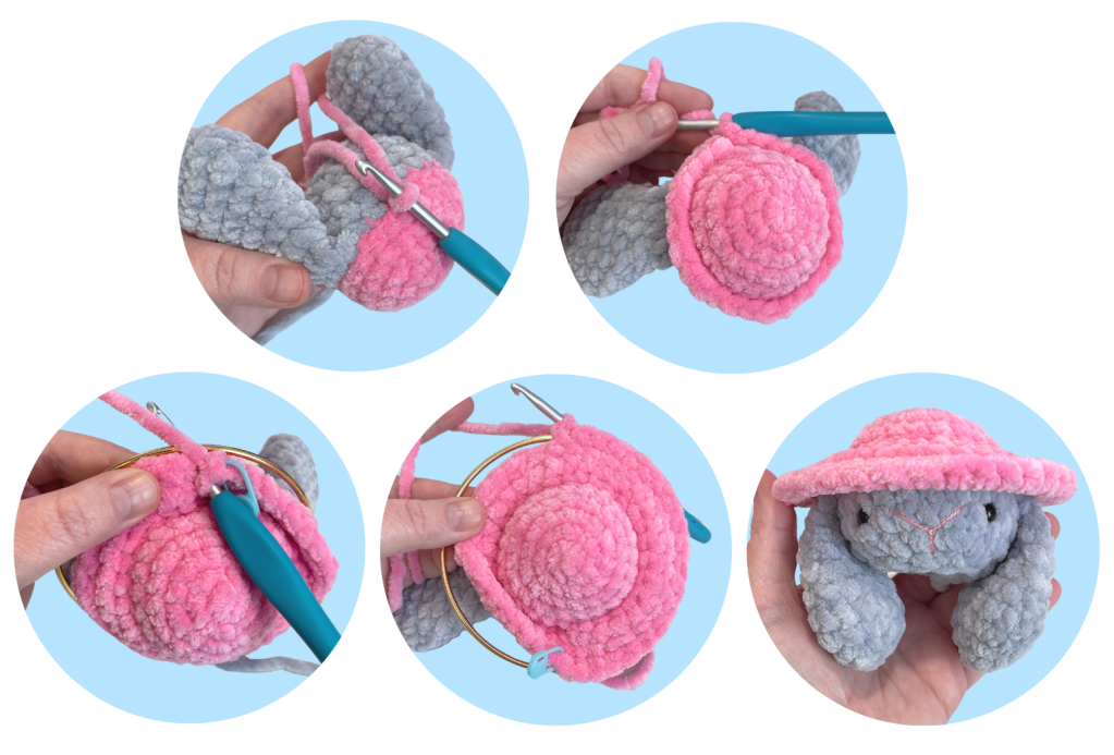 Ideally, your hoop should be only slightly larger than the completed round 3 of your Hat Brim. You want your yarn in round 4 (the round where you add the hoop) to be stretched enough so that the Hat Brim is flat, or slightly dipping down, but doesn’t pop up. Certain yarns can tolerate more stretch than others so some trial and error may be needed to find the right combination of yarn, hook, and hoop. This may sound complicated, but it’s easier than you think once you get crocheting! See examples below.