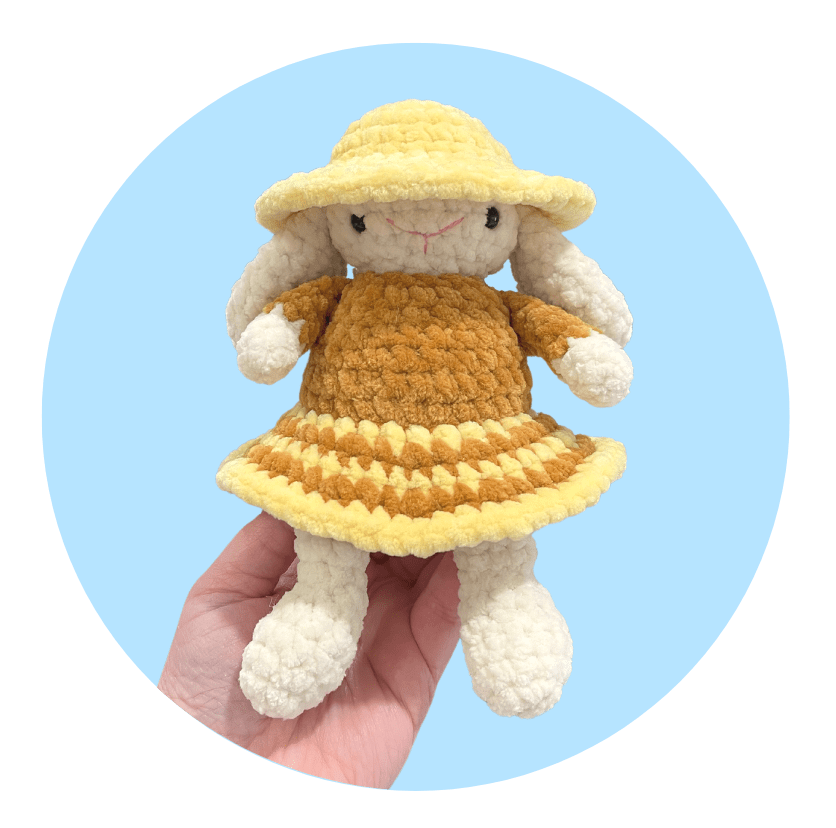 I’ve created this pattern with minimal sewing (yay!): The Ears and Legs are no-sew, the Hat Brim and Skirt are worked onto the Head and Body, respectively. The Head and Arms are sewn to the Body.