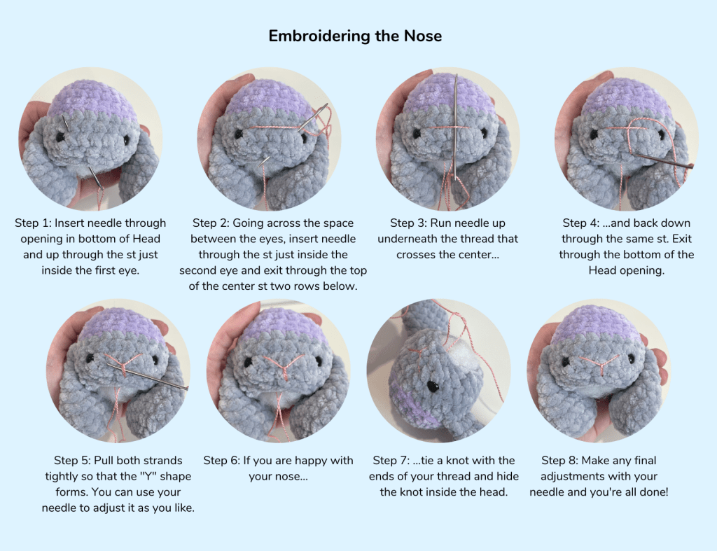 Embroider the nose over rounds 9 & 10. Stuff Head firmly.