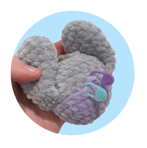 Rd 7 (in BLO): sc 3, sc 4 through first ear and next 4 sts, sc 10, sc 4 through second ear and next 4 sts, sc 3. (24)