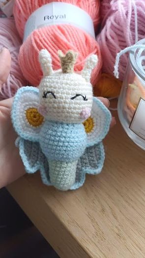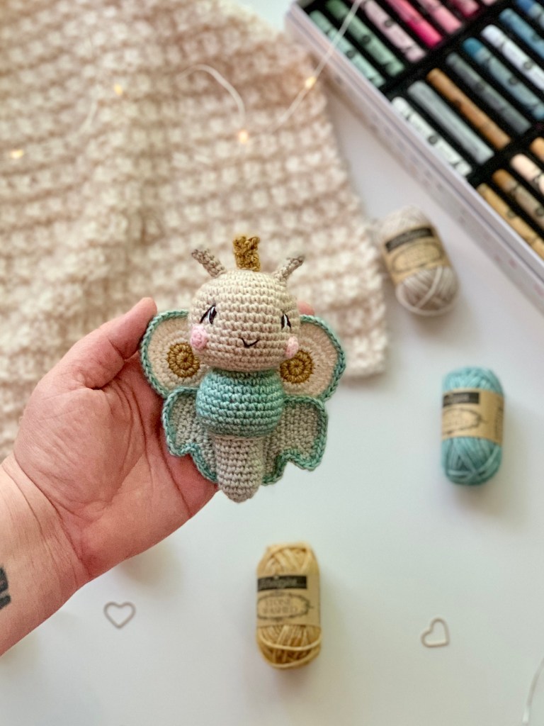 Place the lower wings. I have sewn them with one or two stitches to the body and the rest to the backside of the upper wing. Weave in all the ends.